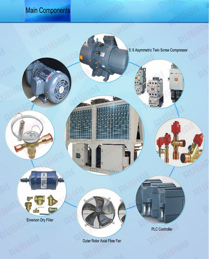 Selected imported brand-name fully-enclosed screw compressors and semi-hermetic screw compressors. Good performance and low noise. According to customer needs and the size of the cold tonnage, a single machine or a combination of multiple machines is used. The compressor can automatically and alternately run according to the load change, balancing the hours of operation of each compressor, greatly extending the life of the ice-water unit.