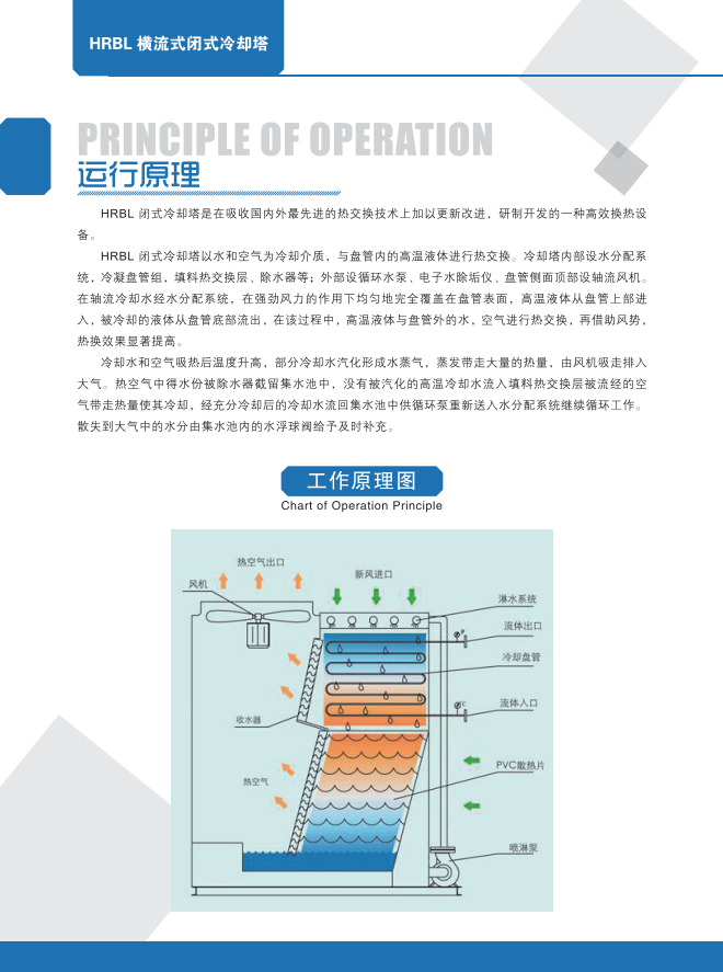 闭式冷却塔(也叫蒸发式空冷器或密闭式冷却塔)是将管式换热器置于塔内,通过流通的空气、喷淋水与循环水的热交换保证降温效果。由于是闭式循环,其能够保证水质不受污染,很好的保护了主设备的高效运行,提高了使用寿命。外界气温较低时,可以停掉喷淋水系统,起到节水效果。随着国家节能减排政策的实施和水资源的日益匮乏,近几年密闭式冷却塔在钢铁冶金、电力电子、机械加工、空调系统等行业得到了广泛的应用