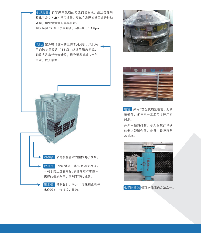温度控制系统:冷却塔在出口设有温度显示及温度报警,并能通过数显温控仪控制喷淋开关来实现进出水温度的调节,使闭式冷却塔在规定的水温范围内对设备连续高效地进行冷却。
