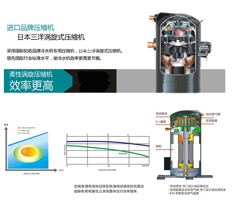 精选原装进口名牌全密闭涡旋式和半密闭涡旋式压缩机。性能好、噪音低。根据客户需要和冷吨位大小,采用单机或多机组合。压缩机可依负载变化,自动交替运转,平衡各压缩机的运行时数,大大延长了冰水机组的使用期限。