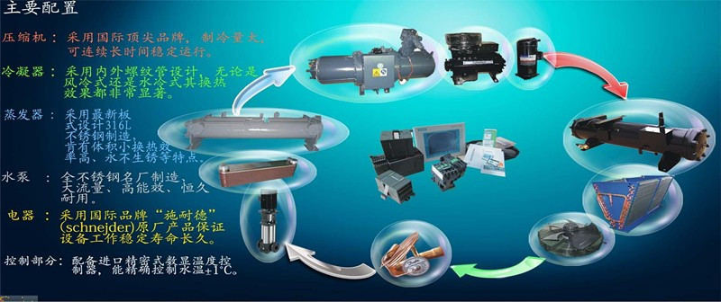 7、 标配不锈钢水箱盘管式蒸发器(可选不锈钢板式蒸发器或不锈钢干式壳管式蒸发器),内置自动补水等装置,清洗维护方便快捷。