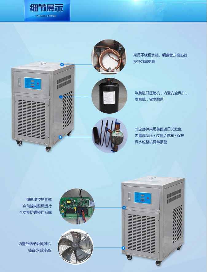 8、采用全自动控制的智能数显温控器,操作简单,控温精确,故障显示直观。温度显示范围0℃~50℃,显示分辨率0.1℃。