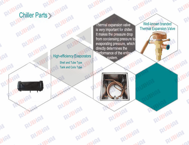 4, equipped with a single-chip microcomputer control system, built-in compressor dryer filter and expansion valve, maintenance hand valve interface and other devices to ensure reliable and safe operation of the machine, convenient maintenance and repair. Compressors Compressors are imported from DAIKIN, SANYO, Copeland and other famous brand fully-enclosed scroll compressors, which are 20-30% more energy efficient than reciprocating compressors. It has the advantages of stable and reliable operation, high efficiency and low failure, low vibration and low noise, and convenient maintenance. According to customer needs and the size of the cold tonnage, a single compressor or a combination of multiple compressors can be used. Compressors can automatically and alternately operate according to load changes, balancing the hours of operation of each compressor, achieving the effects of saving energy consumption and extending the life of the chiller. Hermetic scroll compressors are available in a variety of refrigerant refrigerants such as R22, R407c, and R134a. Shell and tube condenser and evaporator The condenser uses different types of heat exchange copper tubes imported from Germany and Japan and domestically produced. The outer surface of the copper tubes is processed into trapezoidal low-rib tubes to increase the heat exchange area and enhance the heat exchange performance. The inner surface of the copper pipe is smooth, which reduces the water pressure and is easy to clean and maintain. The evaporator uses internally threaded, highly efficient copper tubes. The spiral outer surface of the copper tube is smooth and the water-side baffle adopts a non-short circuit design, which improves the mixed heat exchange efficiency of frozen water.